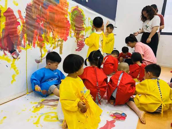 宝宝们愉快的踩着颜料,丝毫不在意衣服是否沾染上了颜料,玩的就是一开心~